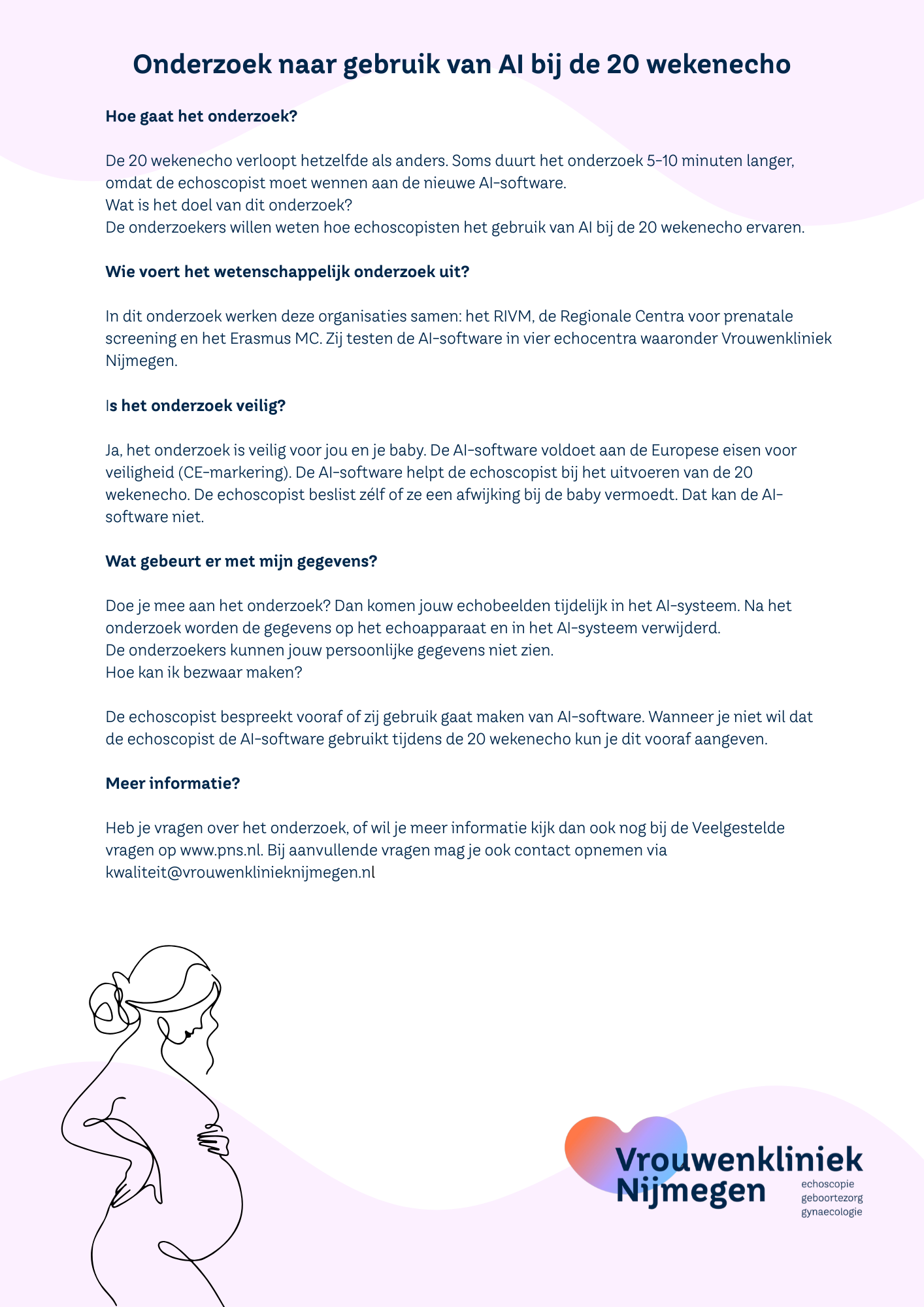 Bij Vrouwenkliniek Nijmegen doen zes echoscopisten mee aan een landelijk onderzoek naar het gebruik van AI-software bij de 20 wekenecho. AI betekent Artificiële Intelligentie (kunstmatige intelligentie). De AI-software is een hulpmiddel waarmee het echoapparaat automatisch beelden kan herkennen. Tijdens de 20 wekenecho zal de echoscopist de AI-software gebruiken. De AI-software helpt de echoscopist om de juiste plaatjes van de baby vast te leggen. De AI-software werkt ook als een geheugensteun. Het houdt bij of de echoscopist alles van de baby heeft bekeken. Wil je meer informatie klik hier.